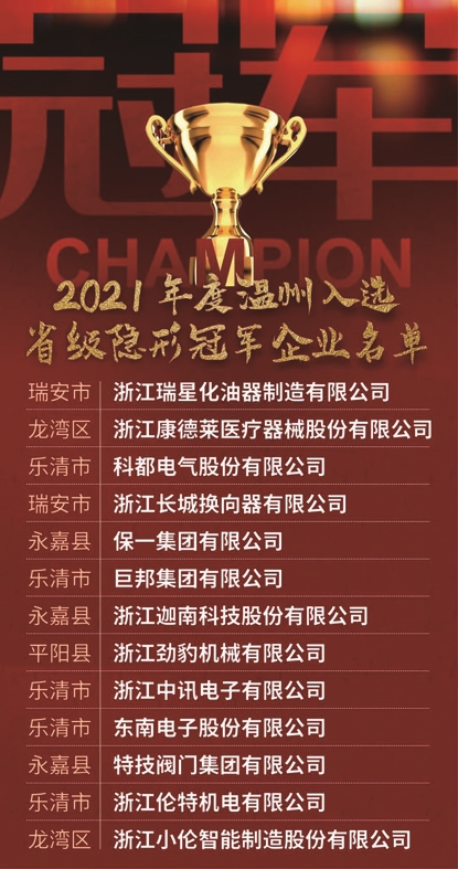 温州13家企业上榜2021年度浙江省“隐形冠军”企业名单