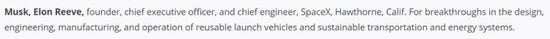 马斯克入选美国工程院院士的理由是:他在可重复使用的运载火箭,可持续运输和能源系统的设计、工程、制造和运营方面取得了突破。