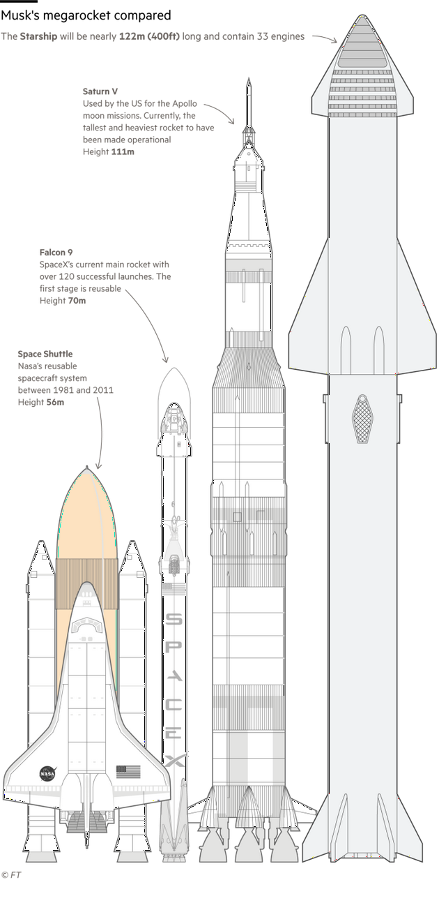 新的SpaceX火箭有近400英尺高,最终完成开发时,它将比运送美国国家航空航天局(NASA)阿波罗任务到月球的土星五号(Saturn V)还要高,其33个引擎所提供的推力将是土星5号的一倍。对于SpaceX创始人埃隆•马斯克(Elon Musk)来说,它将在未来人类在火星上建立殖民地的任务中发挥关键作用。