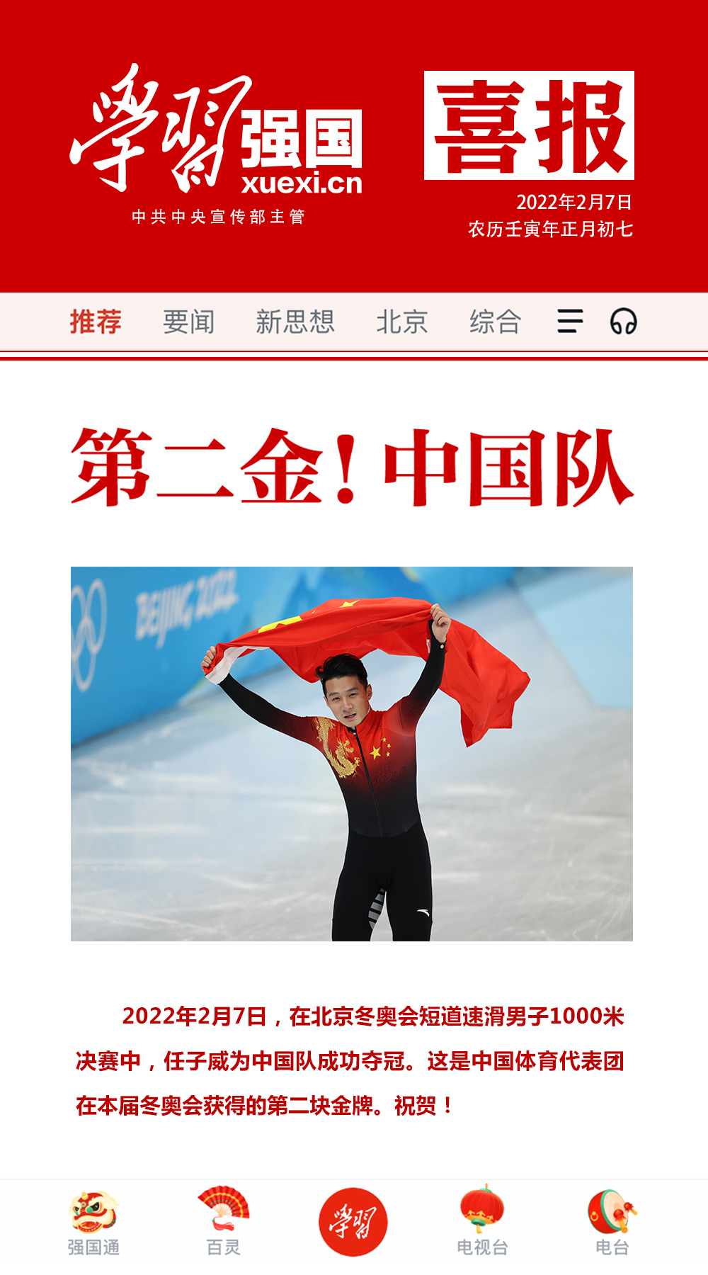 喜报:任子威获短道速滑男子1000米决赛金牌