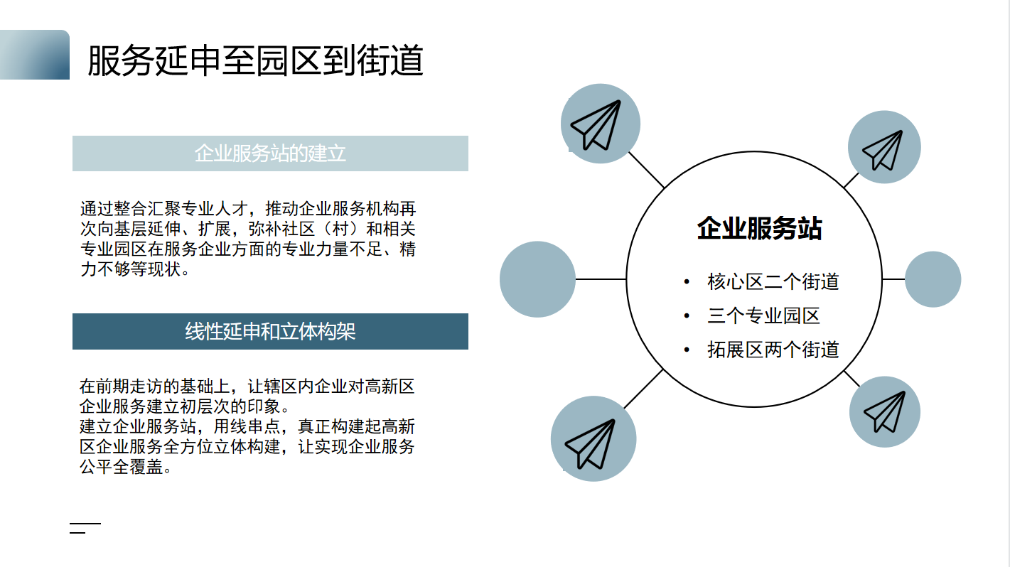 计划建立科技创新谷企业服务站、安科园企业服务站、生物医药产业园企业服务站、三堡街道企业服务站、新区街道企业服务站、棠张镇企业服务站、汉王镇企业服务站七个企业服务站,推动服务企业触角向基层有效延伸,目前,已完成三堡街道企业服务站、科技创新谷企业服务站挂牌,进一步完善了企业服务机制的“全包裹”与“全覆盖”。