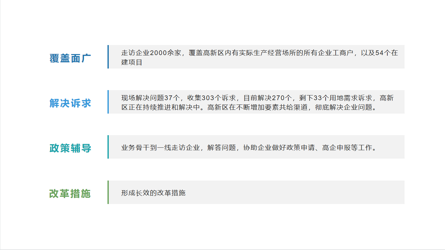 通过走访,高新区结合实际为企业建立“一企一档”,目前通过“一企一档”已经向当地科技局、经发局等政策执行部门提供了政策推送企业名单,试点了政策精准推送。2021年以来,累计收集销售、用工、资金、研发、用地、生活及其他等7大类企业诉求共314个,均得到有效回应。