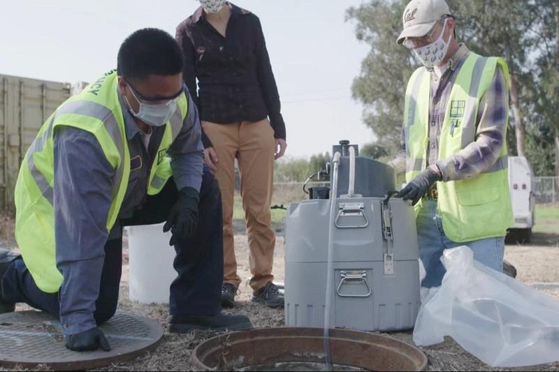 加州大学伯克利分校研究人员开发了一种从下水道系统中收集未经处理的污水并测试其是否存在新冠病毒的方法。图为该校员工从下水道中取出废水自动进样器。