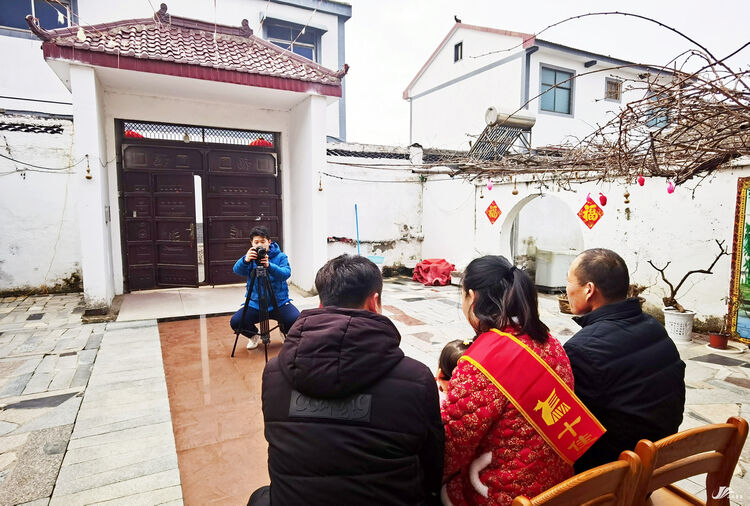 2月9日,伴着浓浓的春意,浙江传媒学院的大学生志愿者王奕皓带着自己的照相机来到贾汪区马庄村,为村里“十佳文明实践户”“十佳好婆婆”“贾汪好榜样”获得者家庭拍摄全家福,定格喜悦的瞬间,让村民们足不出户就能享受亲情、留住幸福。