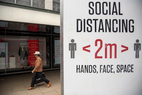7月12日,在英国伦敦,一名男子从提示人们保持社交距离的牌子旁走过。英国政府当日正式确认,英格兰地区将按计划于19日开始实施最后阶段“解封”,同时呼吁民众继续做好新冠疫情防护。新华社发(雷伊·唐摄)