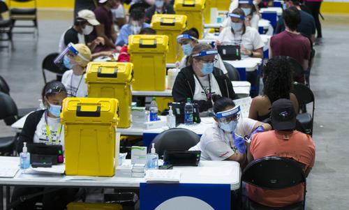 近日,多伦多举办新冠疫苗接种日活动,由400名工作人员在市中心设立的大型新冠疫苗接种中心为约25000名预约民众接种疫苗。新华社发(邹峥摄)