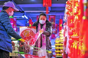 2022年春节前夕,走进观山湖区合力惠民生鲜超市,超市内张灯结彩,生鲜、熟食、春联、礼品等品种丰富的年货琳琅满目,前来采办年货的市民络绎不绝,到处洋溢着浓浓的年味。
