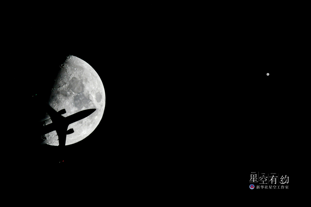 2021年1月21日在墨西哥首都墨西哥城通过二次曝光拍摄的火星(右)和月亮。(新华社记者辛悦卫 摄)