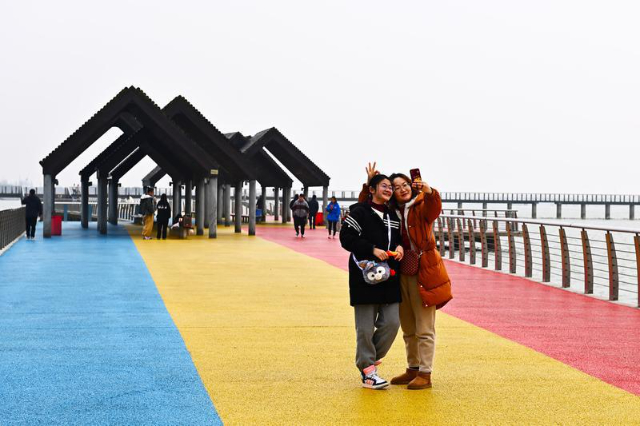 尽管最近几天寒意未消,“彩虹桥”依然吸引了众多游人前来“打卡”。“这个位置景色好。从它开始施工,我们就一直关注着。”网友“问天”和一群舞蹈爱好者都住在武高新,开车到滆湖公园只要十来分钟,节假日大家经常到这里娱乐、健身、拍摄短视频。他说,这段时间,自己拍的视频被上传到抖音后,焕然一新的背景引起不少网友关注,“这里已经变成新网红打卡点了。”(王晓 周茜 贾舟洲)