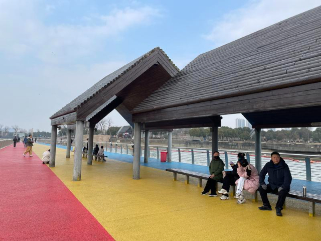 “南、北两处栈道,总长约2300米,面积1万多平方米,去除木板,全部铺上耐用、耐磨的透水混凝土,并选用红、黄、蓝三色美化,象征党建红、活力黄、科创蓝。”周明霞说,考虑到桥体承重,工程材料的搬运、铺装全部通过人工方式完成。“工程于去年10月启动,历时两个多月施工,今年元旦前通过验收、交付使用。”