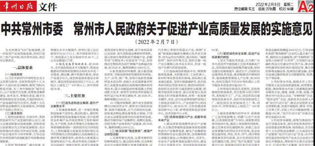 在正月初七的“新春第一会”上,常州推出了《中共常州市委 常州市人民政府关于促进产业高质量发展的实施意见》(以下简称《实施意见》)和与之配套的《关于促进产业高质量发展的若干政策》(以下简称《若干政策》)。