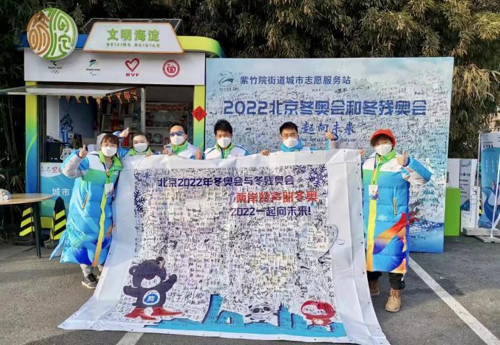 2月6日,林家萱(左二)、陈文成(左四)等参与城市志愿服务的台胞手持签名背景板合影。受访者供图