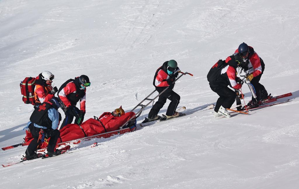 2月10日,高山滑雪医疗队队员用雪橇船将瑞士高山滑雪选手扬尼克·夏布洛茨带离赛道进行进一步救治。新华社记者陈斌摄