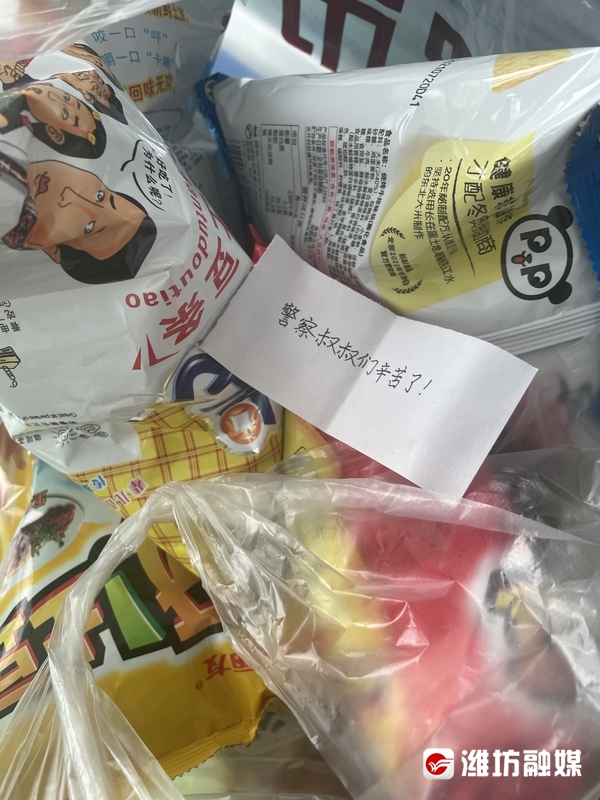 2月2日下午,昌邑市公安局都昌派出所民警刘滕出警回到所里时,在大厅门口看到了一袋零食。刘滕想是不是有人放在这里待会来取,可近看发现,装满零食的袋子里面还有一张纸条,上面写着“警察叔叔们辛苦了!”这时他才明白,零食是专门送给他们的,心里顿时一暖。