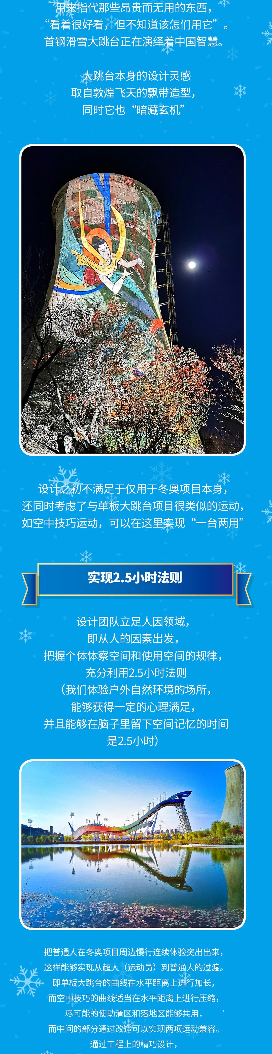 据了解,为了让大跳台看起来“更美更有意义”,大跳台本体的方向角度设置除了符合项目本身的功能需求外,设计团队在设计之初,还特别邀请了曾在这里工作多年的老首钢职工,观摩设计草图,从而遴选出最佳的审美角度。