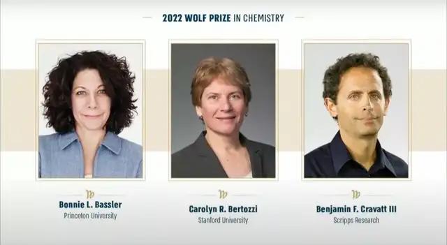 当地时间2月8日17:00,以色列沃尔夫基金会(the Wolf Fundation)公布了2022年度沃尔夫奖(Wolf Prize)获奖名单,其中化学领域的奖项分别颁发给普林斯顿大学的Bonnie L. Bassler教授、斯坦福大学的Carolyn R. Bertozzi教授和斯克里普斯研究所(Scripps Research)的Benjamin F. Cravatt III教授,以表彰他们在理解细胞通讯的化学原理方面、在发明化学方法来研究细胞通讯过程中糖类、脂质以及蛋白质的作用方面所做的开创性贡献。