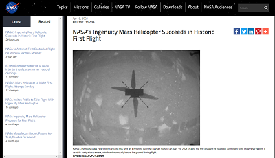 “机智”号直升机火星首飞。图片来源:NASA官网