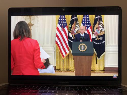 美国总统拜登在白宫举行就任总统65天来的首场记者会,表示应对新冠疫情和恢复经济仍是美国政府面临的最紧迫问题。图为3月25日在美国弗吉尼亚州阿灵顿拍摄的视频画面显示,美国总统拜登(后)在华盛顿白宫举行的记者会上讲话。(图片来源:新华社/刘杰)