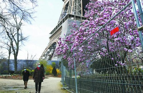 法国总理卡斯泰18日宣布,“法国新冠病毒传播速度明显加快”,自19日午夜起在16个省执行至少为期4周的封闭隔离措施。图为戴口罩的行人从法国巴黎战神广场走过。(图片来源:新华社/高静)