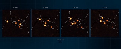 这些带注释的图像是在2021年3月至7月期间通过欧洲南方天文台的甚大望远镜干涉仪(VLTI) 上的重力仪器获得的,图中显示的恒星非常靠近人马座 A*,即银河系中心的超大质量黑洞。图片来源:ESO/GRAVITY collaboration