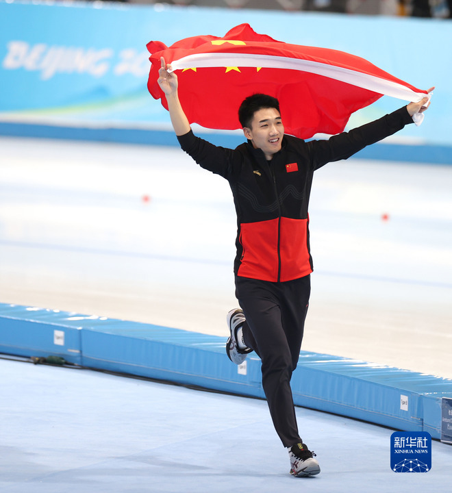 2月12日,中国选手高亭宇在北京冬奥会速度滑冰男子500米决赛后庆祝。新华社记者丁旭摄