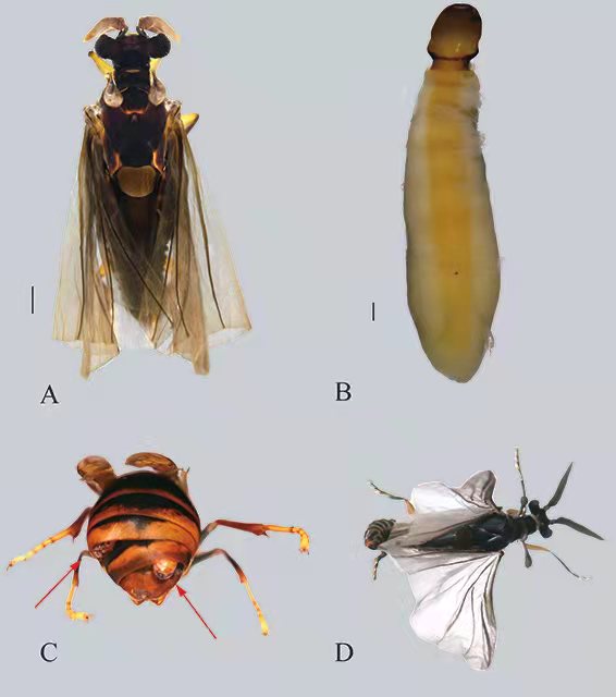 杨氏胡蜂(虫旁加扇)A,雄成虫背面 B,雌成虫背面 C, 箭头所示杨氏胡蜂(虫旁加扇)及其寄主黄脚胡蜂 D, 雄成虫生态照 昆明动物研究所供图