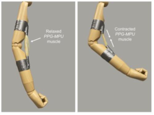 由拉伸形状记忆聚合物制成的人造肌肉,在加热时收缩并弯曲人体模型的手臂。图源:《美国化学会中心科学》