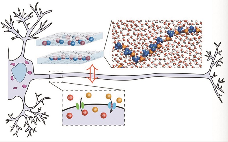 在新实验中,研究团队构建了一个人工神经元原型,其由含有单层水分子的极薄石墨烯狭缝构成。研究人员证明,在电场的作用下,来自这层水的离子可聚集成细长的簇,并产生一种被称为忆阻器效应的特性:这些簇能保留过去接收到的一些刺激,且为了与大脑比较,石墨烯狭缝再现了离子通道、簇和离子流。利用理论和数字工具,研究人员展示了如何组装这些集群以模拟动作电位发射的物理机制,从而模拟信息的传输。