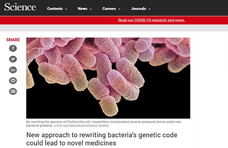 2019年,该研究团队从头开始合成了大肠杆菌的第一个完整基因组,并利用这个机会简化了它的基因组。例如,他们替换了基因组中的一些密码子:用AGC和AGT替换了TCG和TCA,还用TAA取代了TAG。这样,转基因细菌的基因组中不再有TCG、TCA和TAG密码子,但它们仍然可以正常地制造蛋白质,并存活和生长。