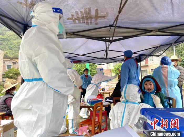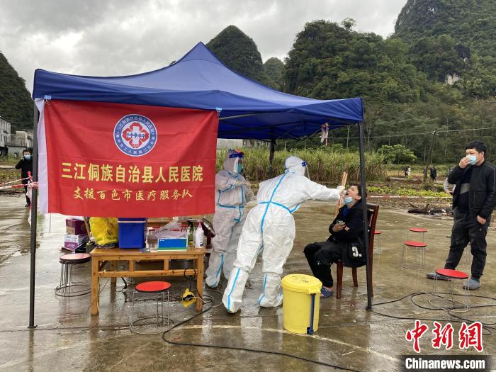 图为三江侗族自治县人民医院支援百色医疗服务队医护人员在开展核酸采样。单依/摄