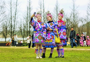 身着民族服饰的游客在月亮湖公园留影。