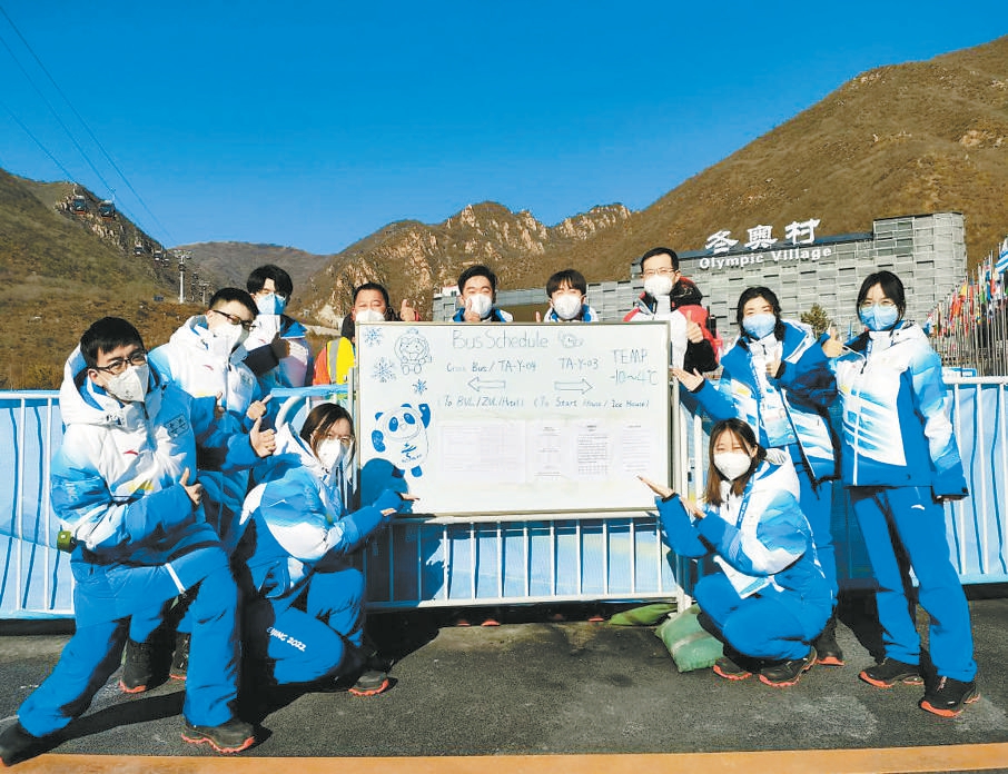 在延庆冬奥村,志愿者们设置班车时刻表提示板并绘制“冰墩墩”,吸引许多运动员打卡。延庆冬奥村场馆运行团队供图