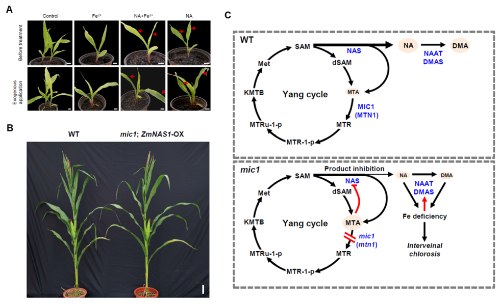 该研究鉴定了一个玉米脉间失绿突变体mic1的候选基因ZmMIC1,该基因编码5’-甲硫腺苷核苷酶是杨氏循环中的一个关键酶。该突变体表现出典型的缺铁表型,幼苗中铁元素含量减少且生长迟缓。转录组分析显示,mic1突变体展现出的脉间失绿症状虽然与已知的铁转运载体缺失表型相似,但是实际上是由烟草胺代谢障碍引起的。通过外源和内源烟草胺回补实验,证实了杨氏循环途径和烟草胺生物合成之间的联系,同时也提示了一种玉米乃至禾本科植物中铁稳态的调控方式,为培育富含铁元素的玉米新种质提供了理论依据。