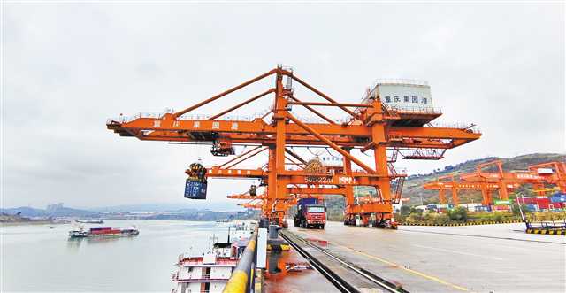 2月7日,果园港到港船舶多,岸桥正在卸载集装箱。记者 向菊梅 摄/视觉重庆