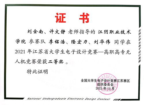 近日,由全国大学生电子设计竞赛江苏赛区组委会主办的2021年度全国大学生电子设计竞赛(江苏赛区)高职高专无人机大赛结果公布,我院机电工程系学生团队荣获二等奖。