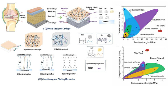 据统计,我国每年需要人工关节置换的患者超过了200万例,但人工关节摩擦界面为硬-硬或硬-软摩擦形式,容易发生磨损而失效,大大降低了人工关节的使用寿命。因此,亟需突破人工关节使用寿命短、翻修率过高的科学瓶颈。基于人体天然软骨的有序取向、多层梯度、软骨/骨一体化结构,仿生设计高承载、超润滑、耐磨损的人工软骨材料,仿生制造高可靠性、长寿命的软-软摩擦人工关节,替代硬-硬或硬-软摩擦人工关节,可解决人工关节磨损问题。近期,我校材料与物理学院陈凯副教授/张德坤教授团队在该领域取得了新的研究进展。