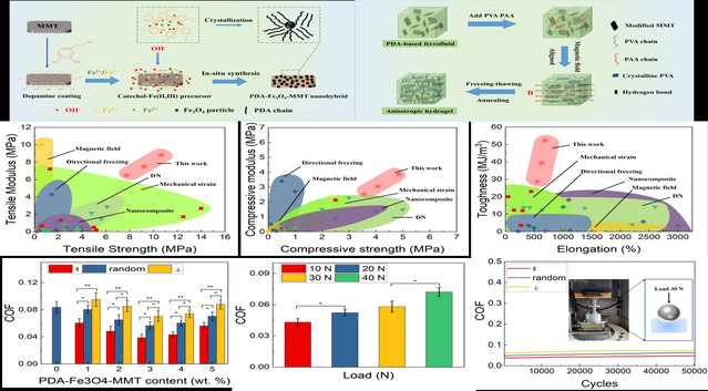 受到人体天然软骨结构的启发,该团队采用磁诱导、冷冻-解冻、退火等技术构建了兼具高强度、低摩擦的各向异性水凝胶仿生软骨材料。该水凝胶仿生软骨材料显示出各向异性的微观结构,并表现出优异的力学性能,拉伸强度为10.65 MPa,韧性为52.2 MJ/m3,压缩强度为4.86 MPa,高于其他的各向同性水凝胶以及大多数报道的水凝胶材料。此外,由于有序结构的存在,水凝胶仿生软骨材料的摩擦系数显著降低至0.038,接近于天然软骨的摩擦系数(0.001-0.04)。该研究结果为研发高可靠性、长寿命的软-软摩擦人工关节提供了基础材料。相关研究成果以“Anisotropic Hydrogels with Enhanced Mechanical and Tribological Performance by Magnetically Oriented Nanohybrids”为题发表在国际期刊Chemical Engineering Journal(JCR一区,中科院TOP期刊)。