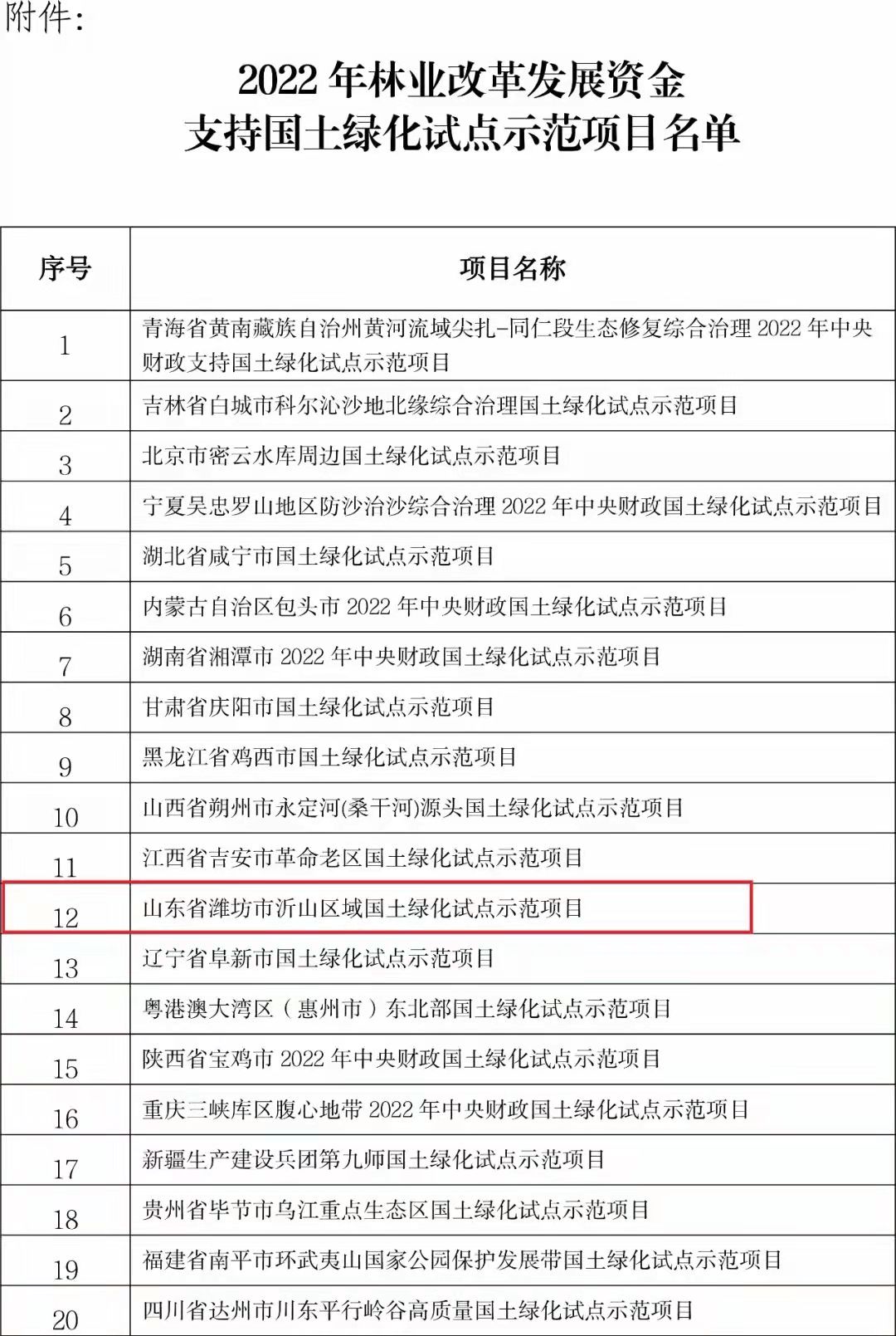 2月17日,财政部公示了2022年林业改革发展资金支持国土绿化试点示范项目名单,全国20个项目入围,潍坊市财政局会同自然资源和规划局申报的临朐县沂山区域国土绿化试点示范项目作为我省唯一项目上榜。