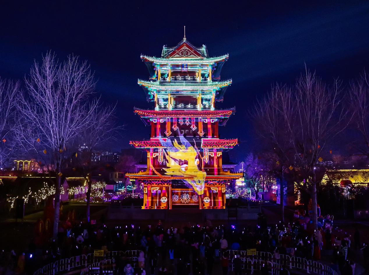 夜间开放后,最吸引人的莫过于裸眼3D建筑灯光秀,百年古建与现代灯光艺术巧妙融合。以杨家埠文润阁、城墙为幕,在光影中体验真正的视觉盛宴。灯光秀从千年文化历史中汲取特色文化元素,打造了一幅充满历史感与科技感的裸眼3D秀,犹如电影院科幻大片,声、光、动巧妙结合,勾勒出恢弘壮丽的风景,不仅照亮夜空,也惊艳了游客,吸引众多市民驻足欣赏,欢呼鼓掌。