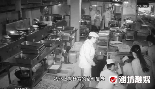 监控显示,当时所有人没有丝毫犹豫,大家马上行动起来,有人负责拨打急救电话,并打开所有通道等待急救人员到来。之后,月子餐厨师姜春红、面点师尹桂芬、厨师崔海龙有条不紊地进行心肺复苏,三人轮番连续按压三分钟后,王先生的面色逐渐红润,这时该院急救中心的医护人员赶到,边抢救边将其送至急诊科重症监护室。经过两天的精心救治,王先生终于脱离危险,目前,已经转入到普通病房。