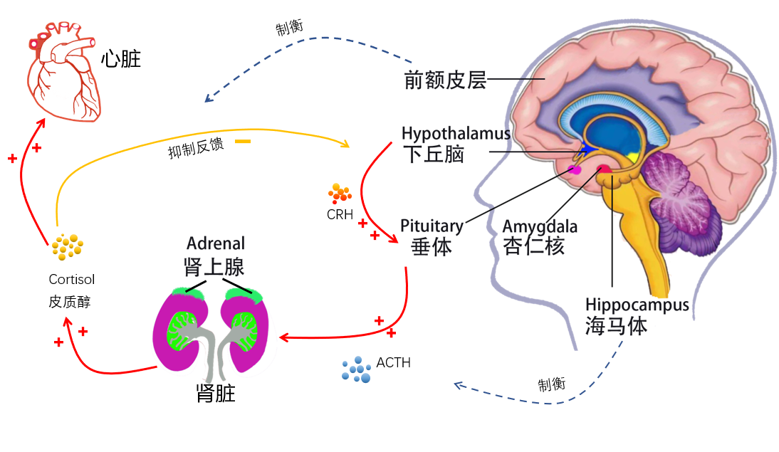 下丘脑类似一个意识筛选器,正常状态下它能防止大脑被巨量信息狂轰滥炸,当大脑侦测到可能的威胁或长期压力,下丘脑立即向垂体释放促肾上腺皮质激素释放激素(CRH),垂体收到CRH后释放促肾上腺皮质激素(ACTH)至血液中,并到达肾上腺,肾上腺分泌一种应激激素——皮质醇(Cortisol)。皮质醇使心跳加快,血压更高,肌肉获得更多血液,人可以在瞬间对威胁做出反应,比如逃跑或搏斗;皮质醇水平的适度上升使得身体和大脑处于高度警戒状态,让人思维清晰,专注度提升。反过来HPA轴也有反向抑制功能,当皮质醇分泌水平过高,则会发出反馈性抑制信号,使得垂体的ACTH及下丘脑的CRH激素分泌减少,确保HPA轴处于动态的平衡中。另外,大脑前额叶和海马体不但有记忆功能,而且也有抑制大脑过度反应的功能,就像刹车制动系统一样让我们的HPA轴稳定地工作。