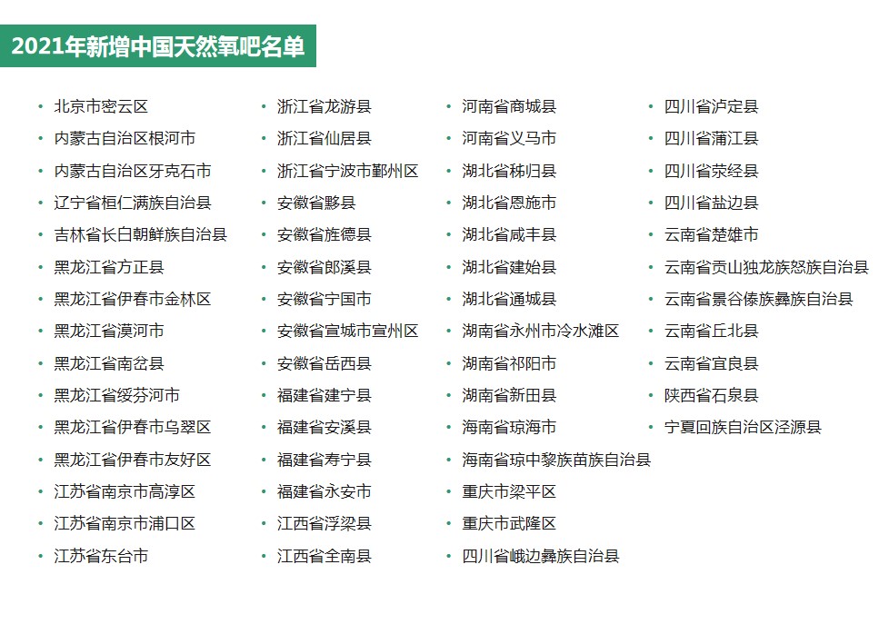 中国天然氧吧共有249个 覆盖27个省(区、市)