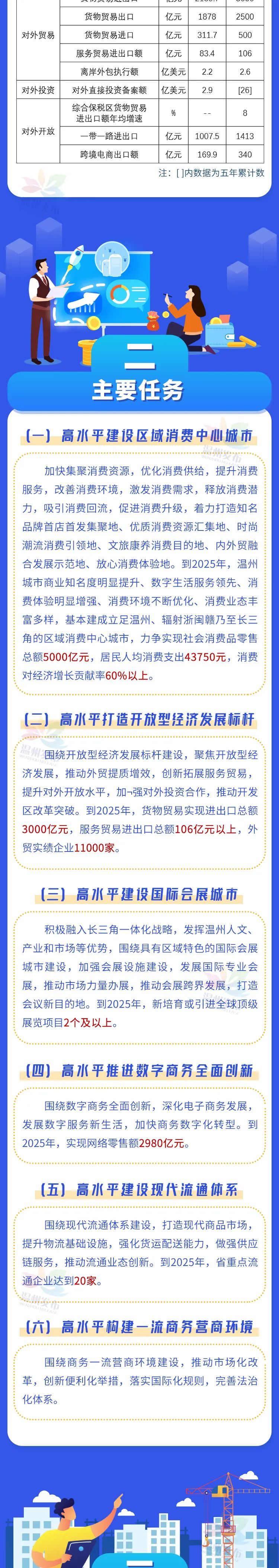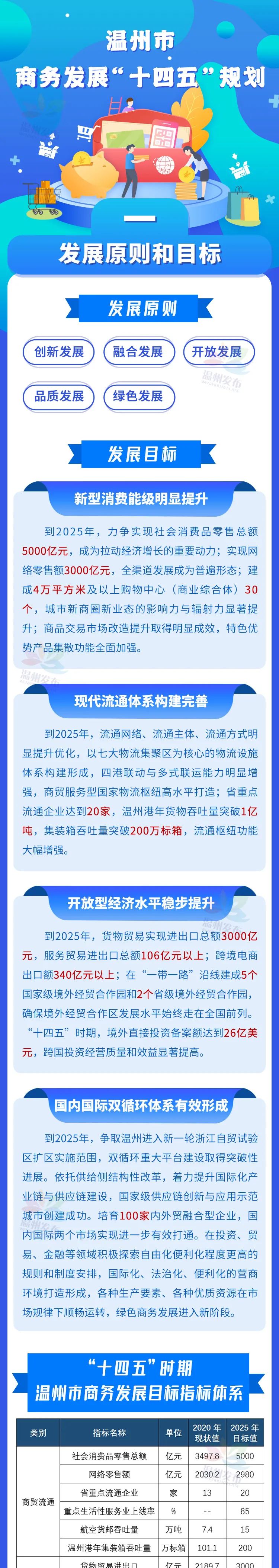 温州网讯 日前,我市发布《温州市商务发展“十四五”规划》,为“十四五”期间的商务工作描绘了发展蓝图。根据《规划》,温州将高水平建设区域消费中心城市、打造开放型经济发展标杆、建设国际会展城市、推进数字商务全面创新、建设现代流通体系、构建一流商务营商环境。