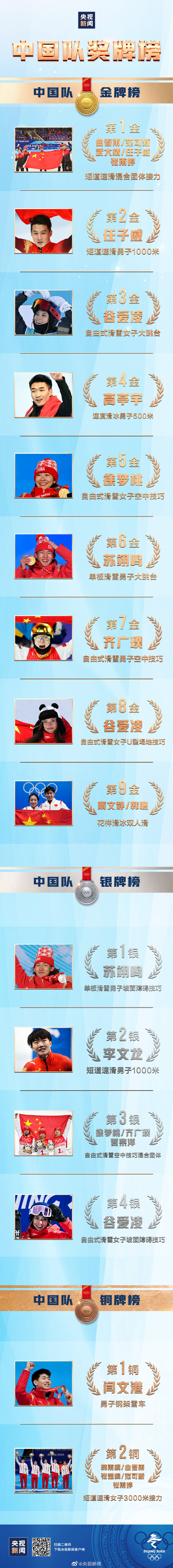 北京冬奥会所有比赛结束。北京冬奥会,中国队9金4银2铜收官,金牌数和奖牌数均创历史新高。其中钢架雪车、冰球等项目,也刷新了最好成绩。祝贺不断带给我们惊喜的中国队,为中国健儿喝彩!