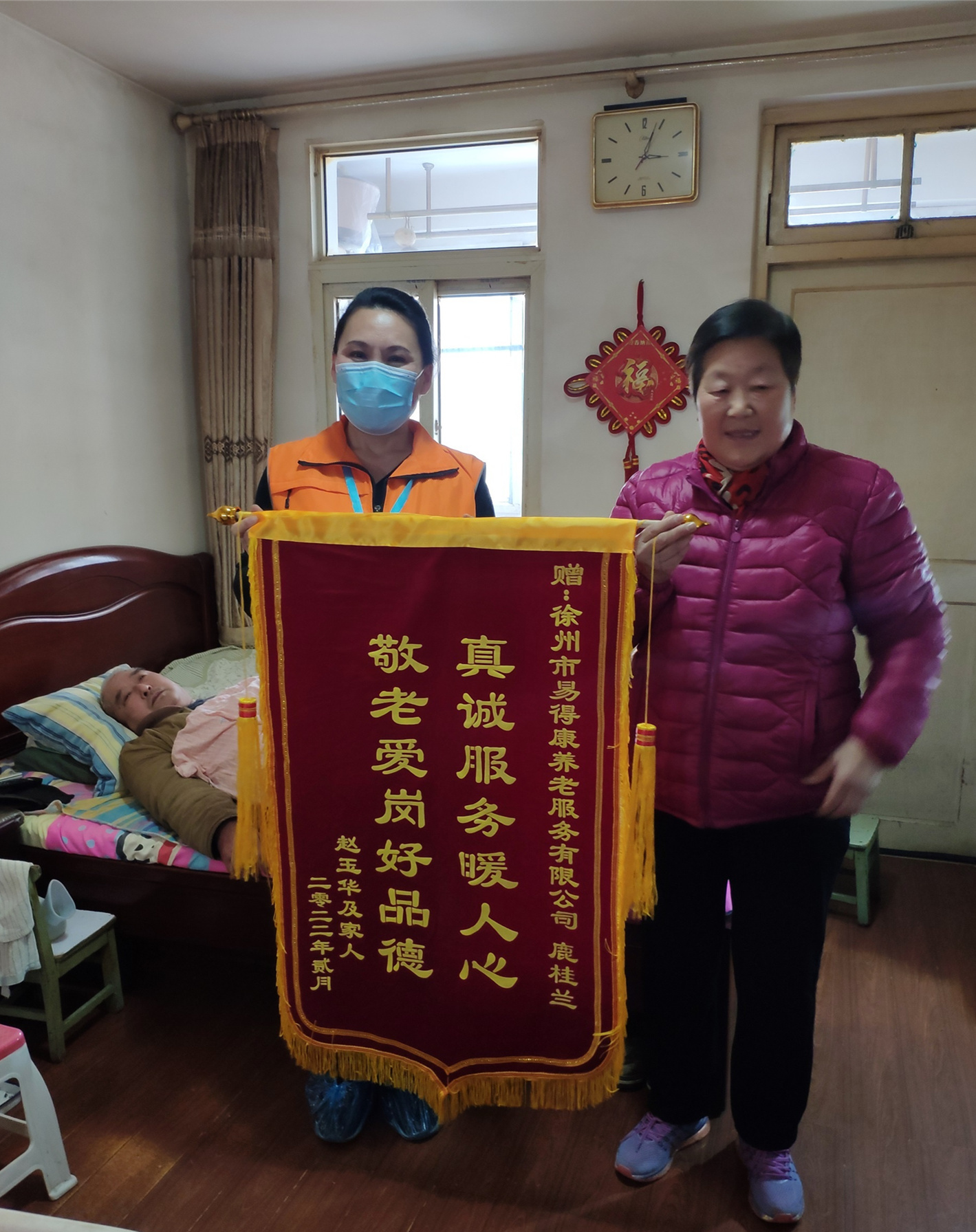 “我们老两口商量着怎么感谢小鹿,就做了一面锦旗给她。”锦旗上写着“真诚服务暖人心 敬老爱岗好品德”。锦旗上的字表达了曹玉民夫妻对护理员工作的肯定,也反映出他们对于医保长护险政策的肯定。