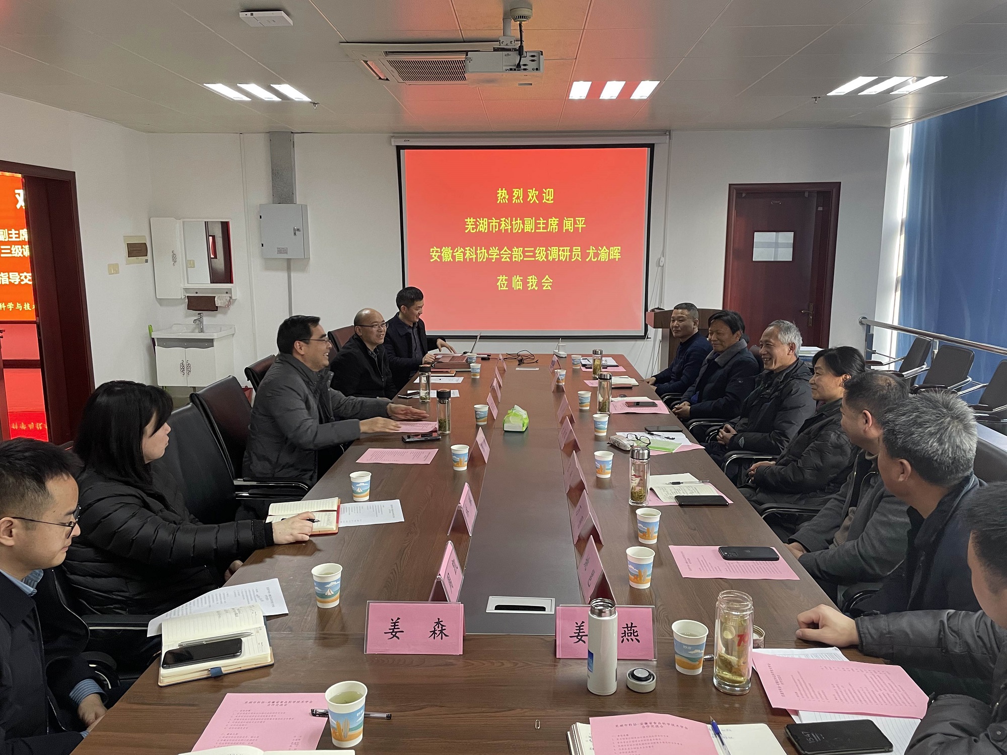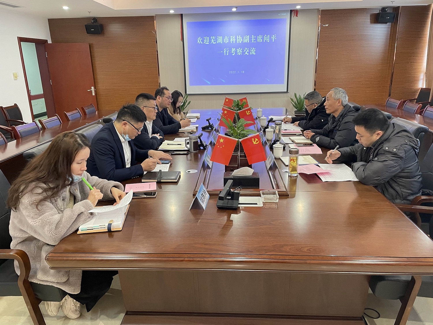 为进一步推动芜湖市“科创中国”试点城市建设工作,按照省科协统一安排,1月17日,市科协党组成员、副主席闻平带领学会部、无为市科协等一行6人,利用3天时间,先后走访省人工智能学会、省科学家企业家协会、省食品科学技术学会、省汽车工程学会等单位,对接商谈市“科创中国”试点城市建设有关工作,省科协三级调研员尤渝晖参加座谈交流。