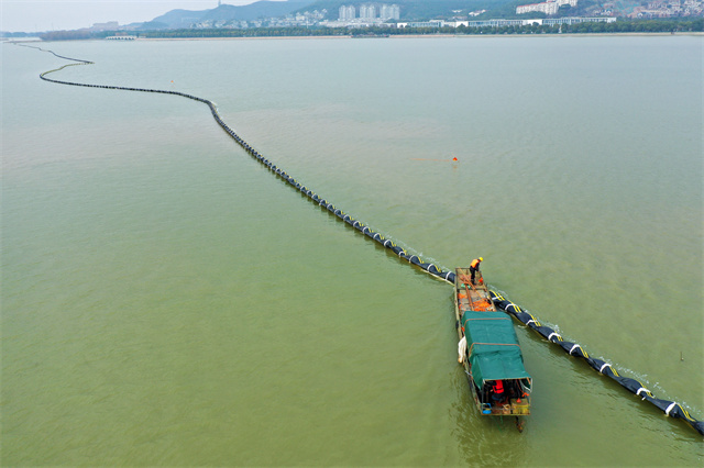 眼下,武进区农业农村局生态站正在开展太湖沿线常州辖区范围内的7000米橡胶挡藻围隔的更新工作。据悉,橡胶挡藻围隔主要起到导流和拦截蓝藻的作用,此次更新的围隔位于挡藻防线的最外围,遭受的风浪较大,部分存在撕裂现象。更新工作将在下月初完成。