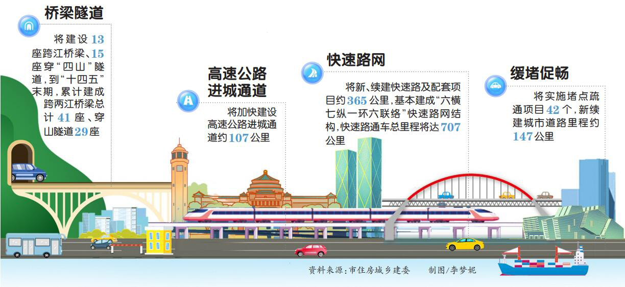 为打通过江通道和穿山瓶颈,《规划》提出,“十四五”时期,将建设13座跨江桥梁(跨嘉陵江6座、跨长江7座);15座穿“四山”(即中梁山、铜锣山、缙云山、明月山)隧道(穿中梁山7座、穿铜锣山5座、穿缙云山3座)。至“十四五”期末,累计建成跨两江桥梁总计41座(含高速桥梁),穿山隧道29座(含高速隧道)。