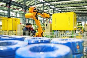 贵州玉蝶电工股份有限公司电线电缆智能生产车间,技术人员在查看智能设备运行情况。 贵阳日报融媒体记者 石照昌 摄