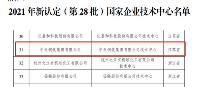2月24日,国家发改委网站公布2021年(第28批)新认定的国家企业技术中心名单通知,中天钢铁技术中心名列其中,正式认定为国家企业技术中心,成为2021年常州市唯一入选企业。